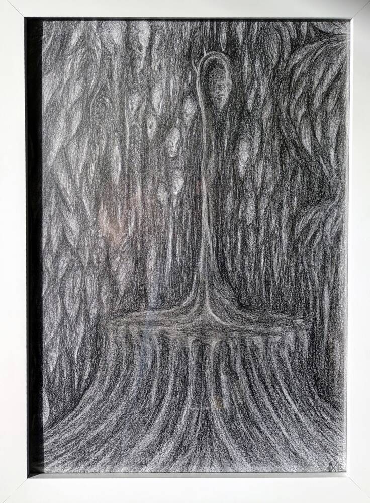 A3 size graphite drawing of a plant like statue type feature amidst abstract style foliage. Very macabre and detailed.