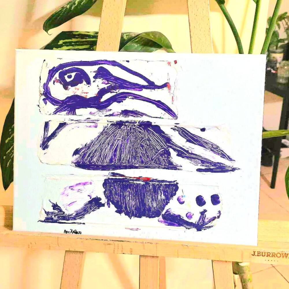 This piece captures a fragmented creature in motion—part bird, part memory—split across three bands like moments in time. Bold purples and deep textures evoke a sense of raw emotion and inner duality. There’s a primal energy in its form, as though pulled from the subconscious. Flecks of red suggest hidden truths or emotional rupture. It speaks to transformation, identity, and the unseen layers beneath the surface.