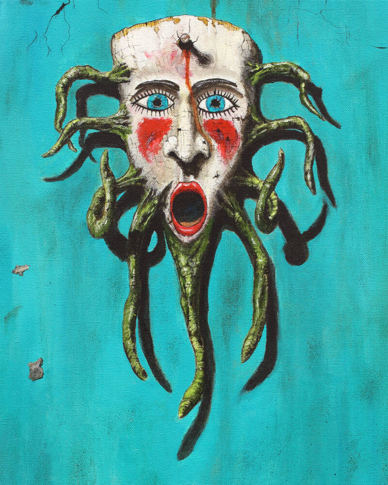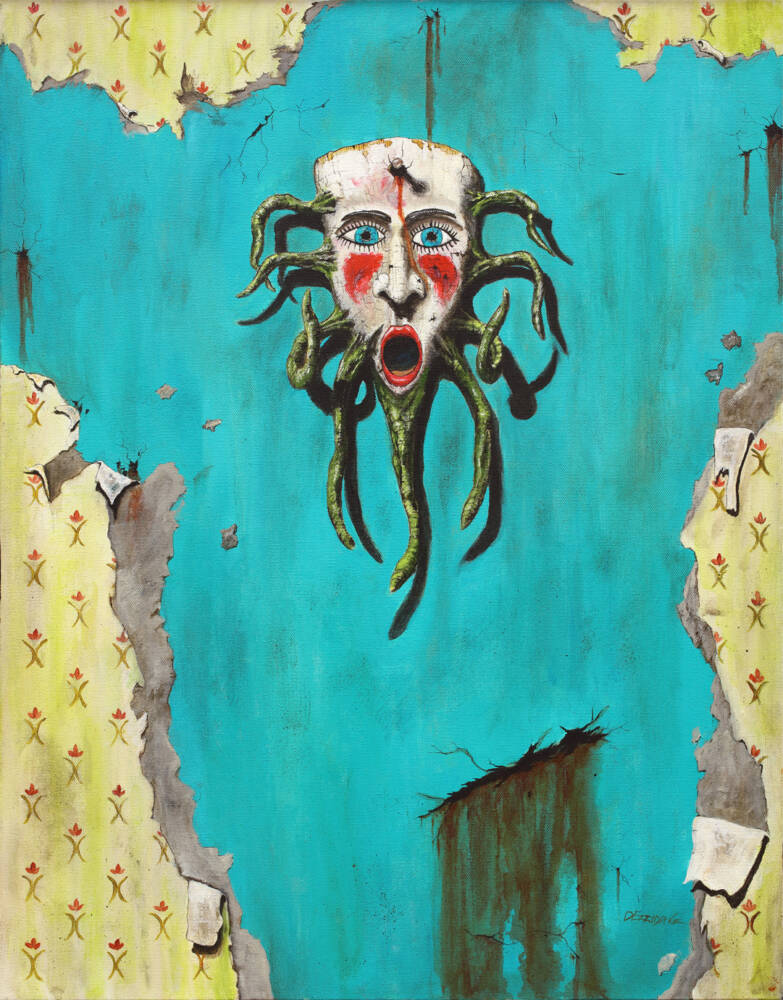 from a series of works featuring vintage, carved masks from Mexico.