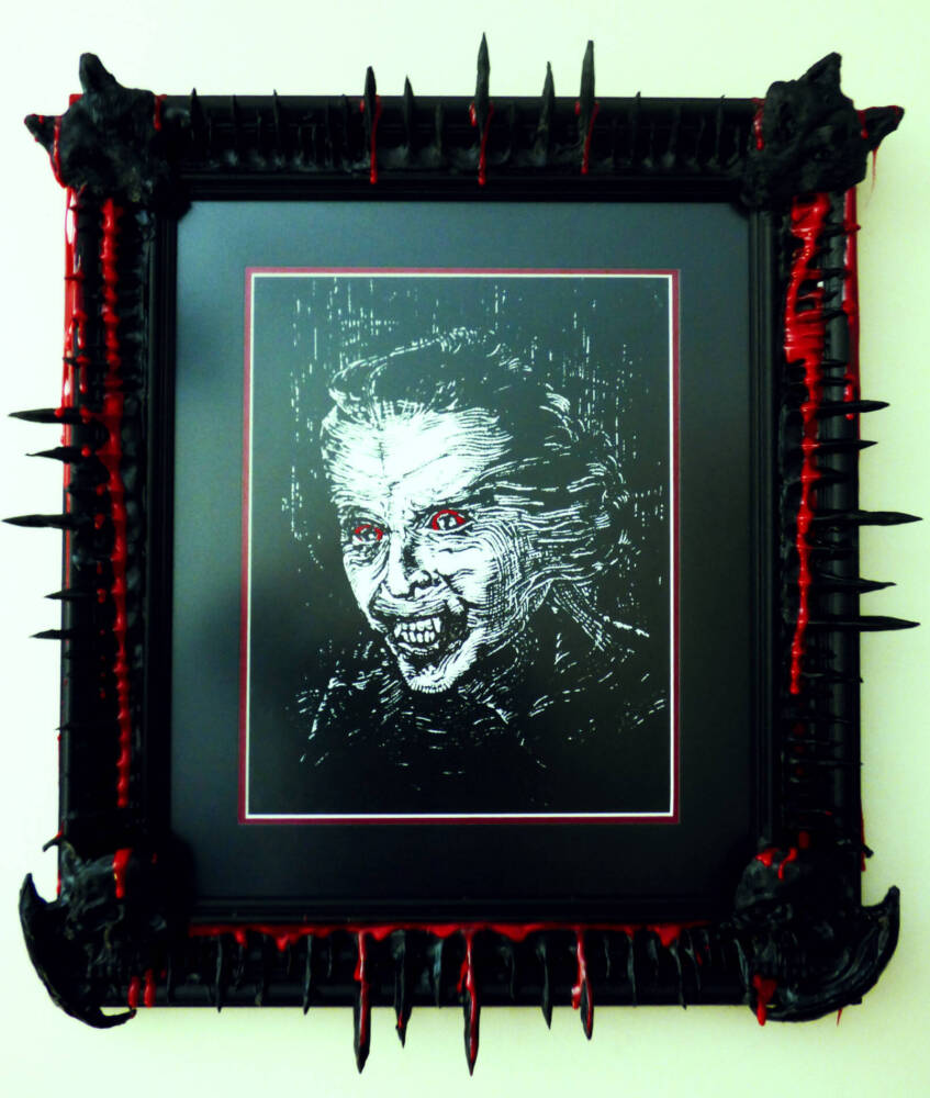 Screen print in a custom frame, resin, wood. Based on a prop from the Hammer Horror film “Dracula AD 1972”. Both Van Helsing and Alucard had one in their home.