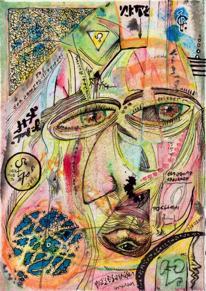 Darkened eyes open to the mists of illusion, peering through the haze and looking upon words of knowledge and encoded mysteries. Divine wisdom gleaned through a murky reality.