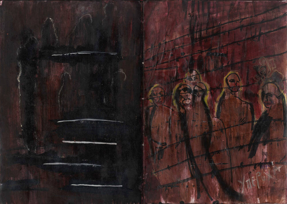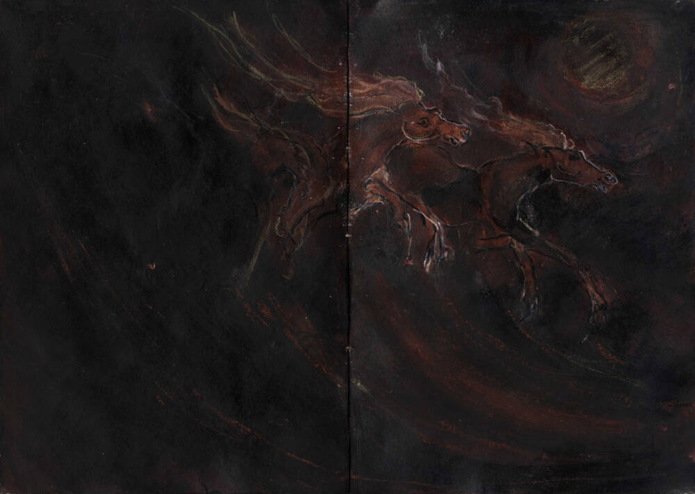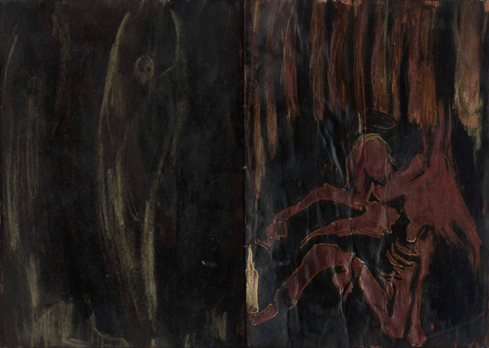 This Art book is handmade, with a leather cover and consists of 23 pages, each containing an artwork. All together they form a dark story. media, oils, acrylics, ink, wax. You can see the rest of the images in Memories Book I.