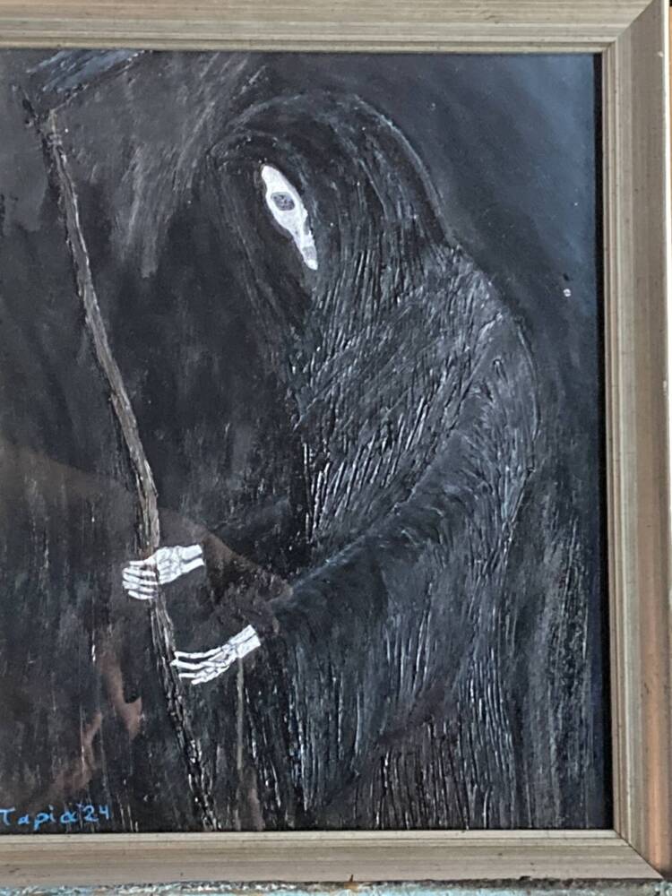 Opposite him stands the girl—naked, fragile, suspended between fear and surrender. Her exposed body carries a subtle erotic tension, not as provocation but as affirmation of life itself: vulnerable, desiring, finite. In her nudity there is no defense, only acceptance. Between both figures unfolds a silent dialogue in which death approaches not as a destroyer, but as a mirror. The work speaks of the threshold where life and death recognize one another—and where meaning arises through acceptance of impermanence.