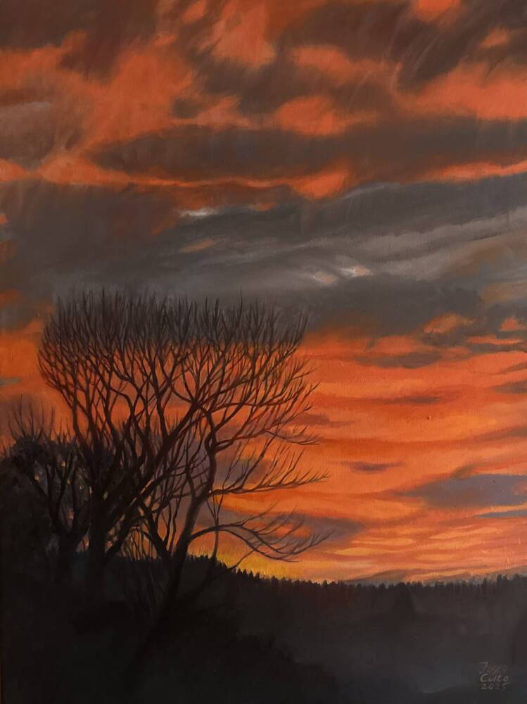 The sun ignited the clouds, turning the sunset into one of nature’s most beautiful spectacles. The black silhouettes of the trees and the red sky create an ominous atmosphere of a witch’s festival. No birds or dwellings are visible. This painting is a window for the viewer. Through this window, the soul, like a night bird, will fly into the sunset, soar above the wild forest, inhale the mist of the lowlands, perch on the top of an ancient tree, and freeze in rapture, contemplating its beloved eternal twilight.