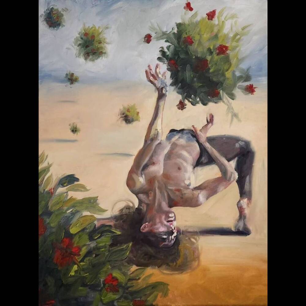 The dramatic pose is set on a desert, surreal, landscape hinting at isolation and emptiness. Surrounding the figure are floating bushes with flowers blooming, seemingly coming from the figure itself. The face is contorted in suffering – speaking to the pain and suffering it takes to create our own meaning and purpose in life. No matter how barren our lives, we can always grow.