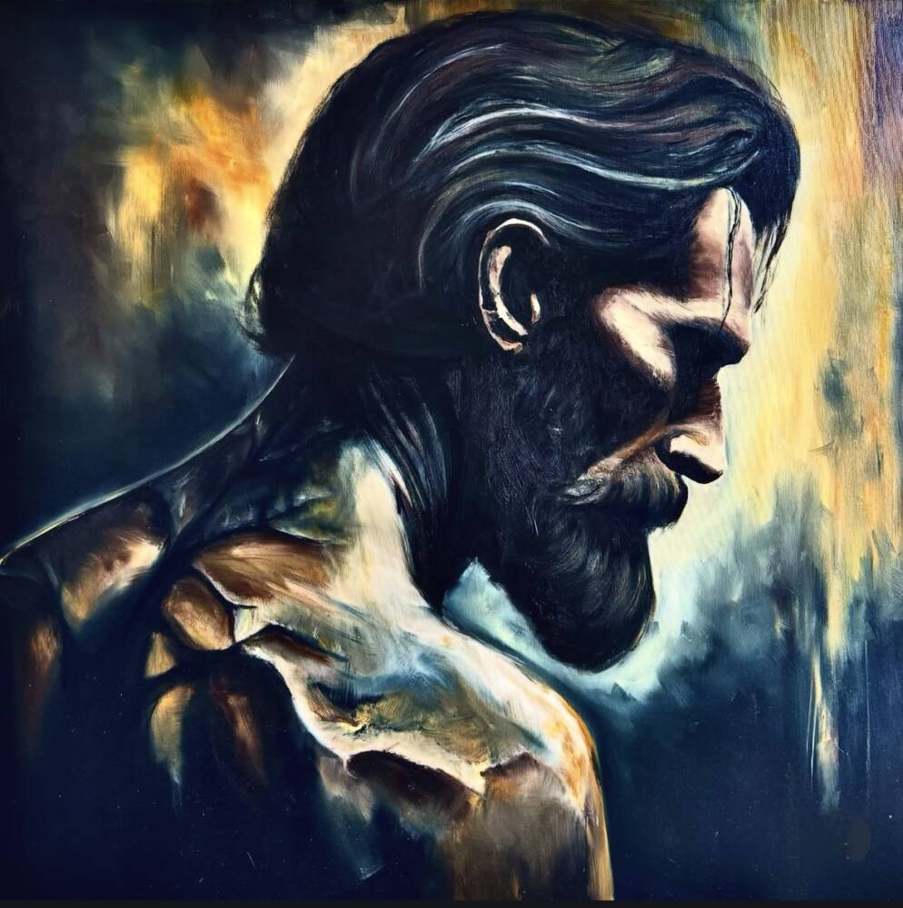 Genotype is a portrait of a man locked in introspection – a frozen gesture of pain, withdrawal, or contemplation. His body, tense and cracked, is more than anatomy; it’s a map of inherited trauma. This painting speaks of what lies encoded within us – in genes, in cellular memory, in shadows passed down through generations. It’s about what we carry, often without knowing why.