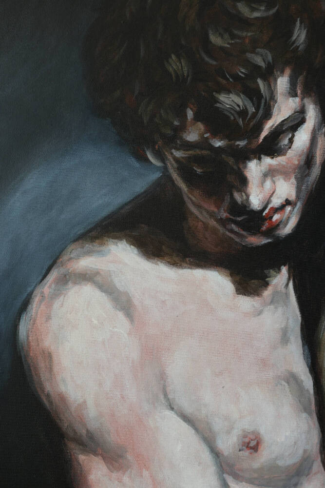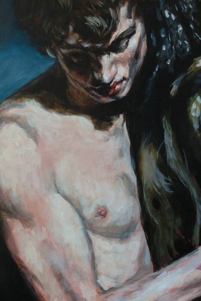 The work depicts two figures in a complex and paradoxical embrace that is simultaneously filled with passion and an underlying threat. The artist, using acrylic on canvas, creates a suggestive composition where contrasts and dualities play a key role. The fragility of the male figure in the foreground is emphasized by the light color of his skin, which makes him vulnerable against the deep, dark tones of the painting. This fragility is starkly contrasted with the ominous, dark figure in the embrace, whose body appears almost jelly-like.