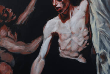 This painting from the series In Amplexu Teneo is a powerful example of figurative art that transcends simple representation to delve into a complex psychological and symbolic space. The acrylic on canvas work is distinguished by its expressive and dynamic brushwork, as well as its masterful use of light and shadow (chiaroscuro). The scene captures two men in an intimate embrace, yet their hunched and tense postures, along with the unsettling red marks on the skin, suggest an experience of pain or inner conflict rather than peace and love. The artist thus creates a visual paradox where the title, referencing an embrace, contrasts sharply with the dramatic and disturbing content of the painting itself.