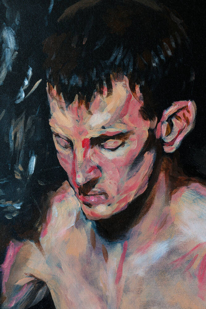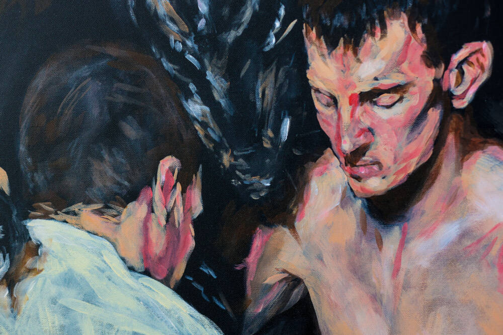 The work embodies Maroš Rovňák’s characteristic approach to queer themes and his exploration of what Freud called “das Unheimliche”—the uncanny. The painting evokes a sense that beneath the surface of a familiar, seemingly safe situation, something hidden and menacing is lurking. By revealing vulnerability and suffering within an act that should be a pure form of support, the artist forces the viewer to confront the uncomfortable aspects of identity, relationships, and existence. The painting is thus not merely a testament to an intimate moment, but a powerful statement about the hidden pressures and struggles that shape the human experience.