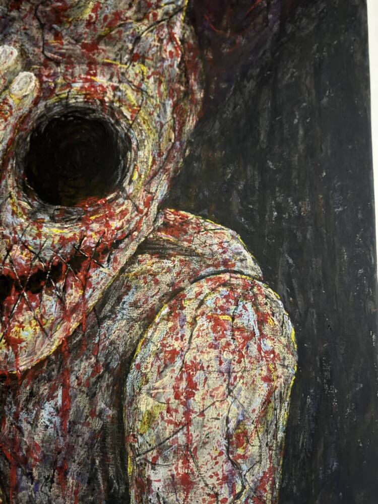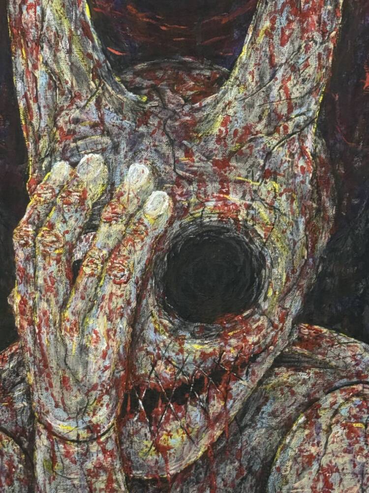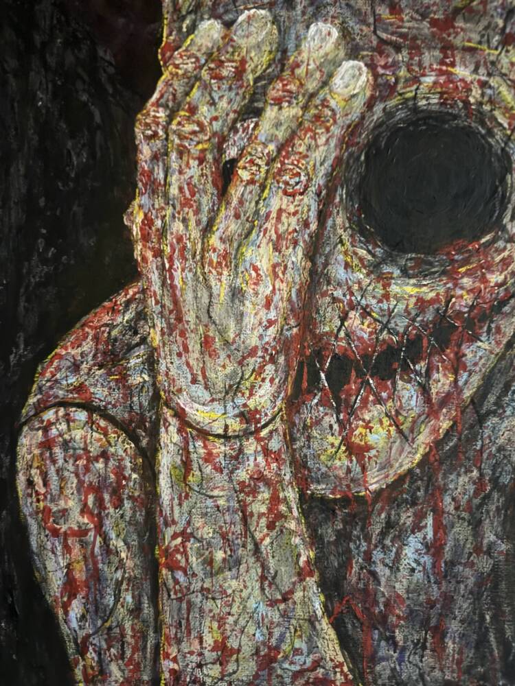 This dramatic figure with a mask-like face and a dark, hollow eye stands out for its haunting quality. The thick textures and splashes of red create a sense of horror, fear, and loss of self. The hand blocking the face makes it even more mysterious.
