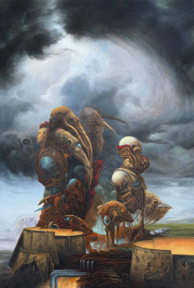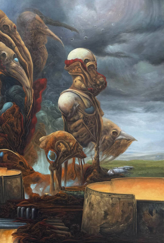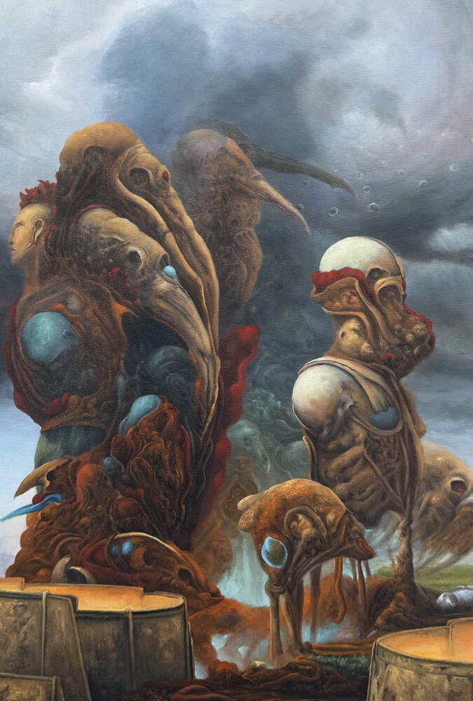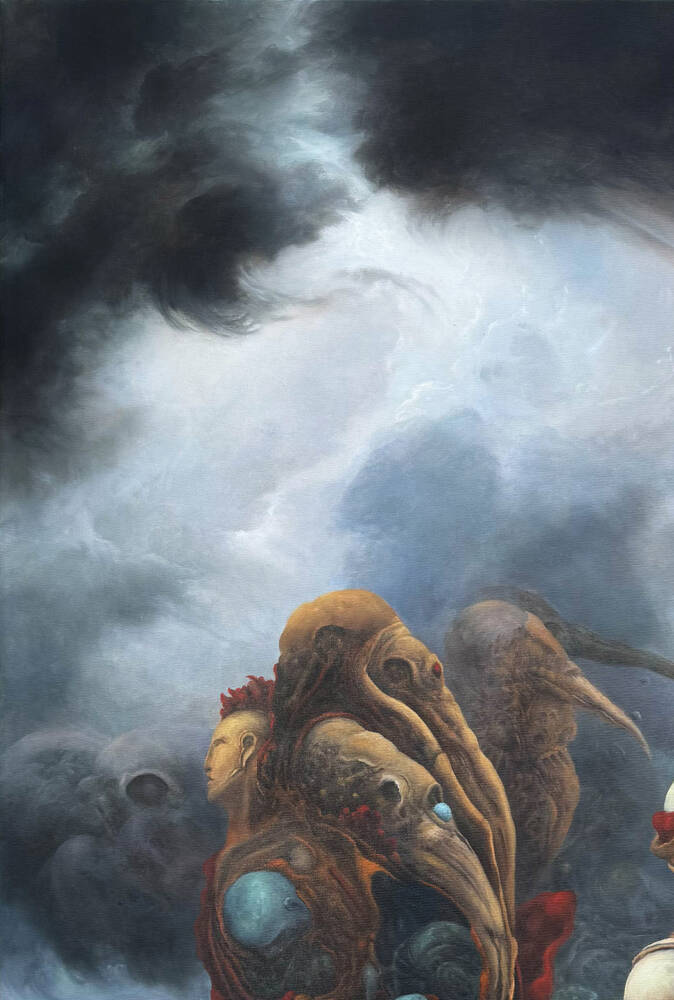 The painting presents a cycle rather than a single moment, an in-between space where bodies and souls are neither lost nor preserved, but continuously transformed. The figures, half humanoid and fish-like, appear in a state of dissolution, their forms breaking apart and returning to something more elemental.
