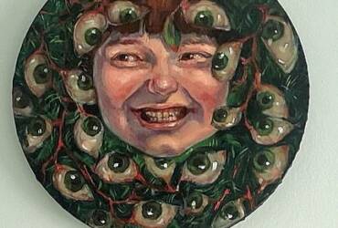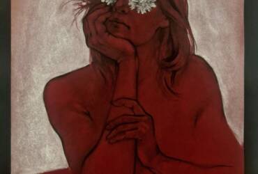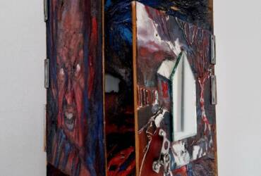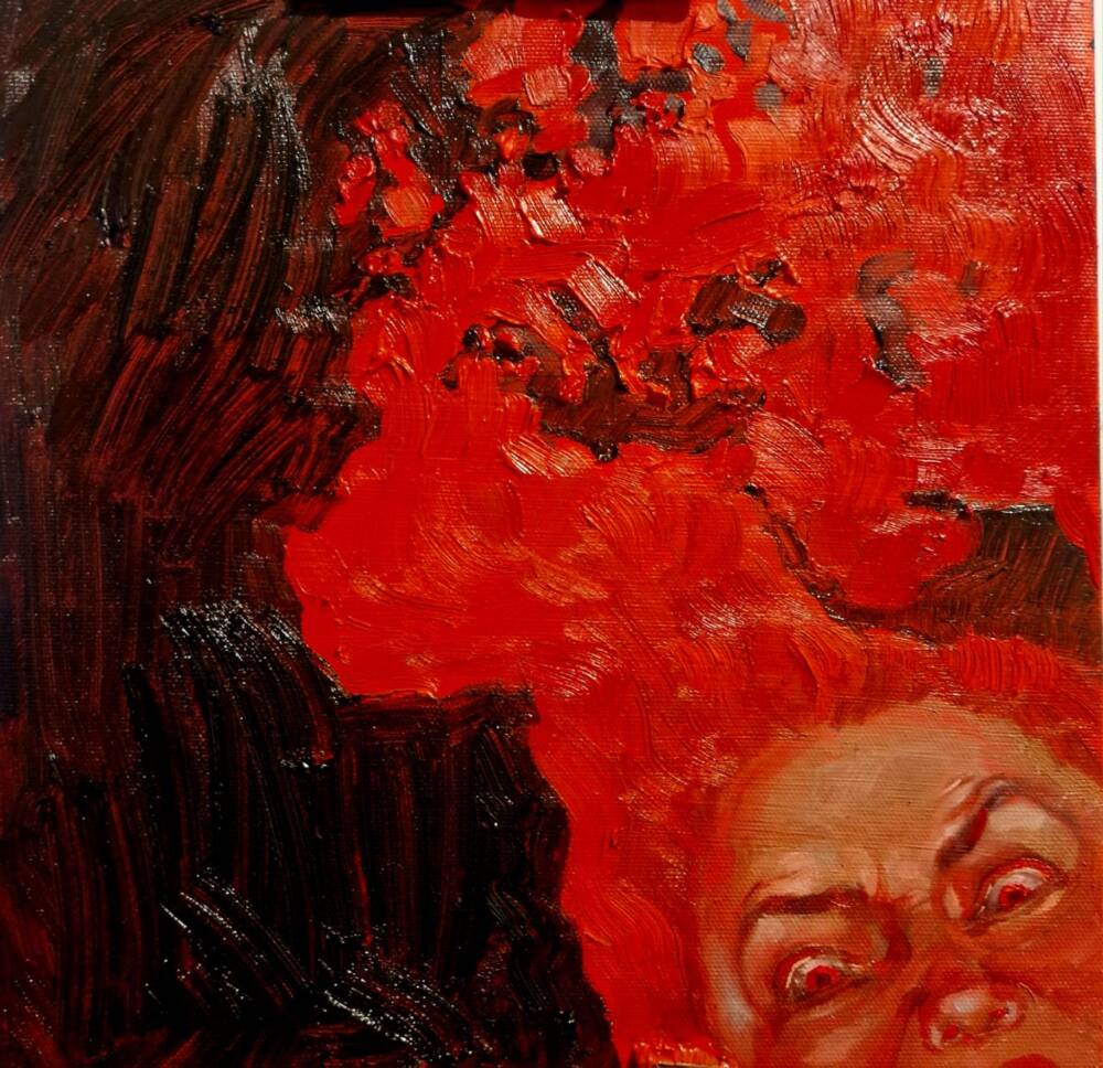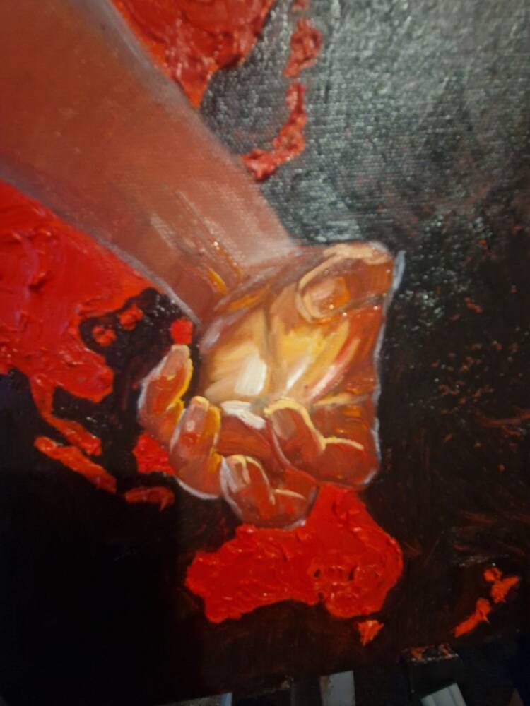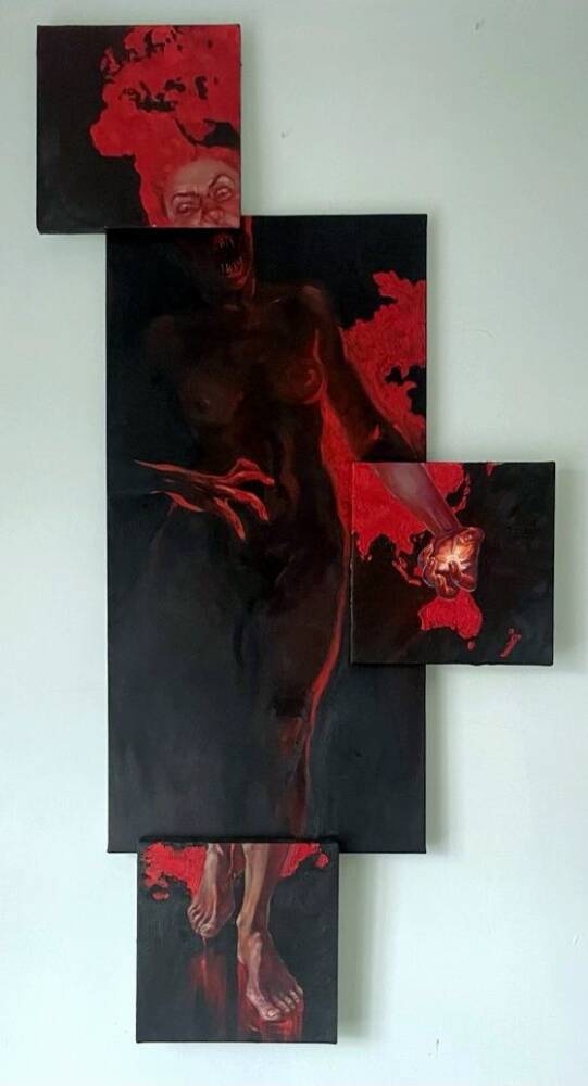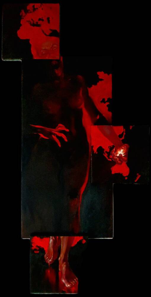 This work features multiple panels forming a fragmented yet cohesive human figure—dark, demonic, and consumed by red fire. Flames and flesh merge, symbolizing rage or transformation.The red spots vaguely resemble the outlines of the Earth’s continents, since the threat is one and common to all. The asymmetric composition emphasizes instability and fragmentation, pointing to a splintered identity. Through a mix of realism and abstraction, the piece explores the boundaries of the self in a burning, aggressive space.