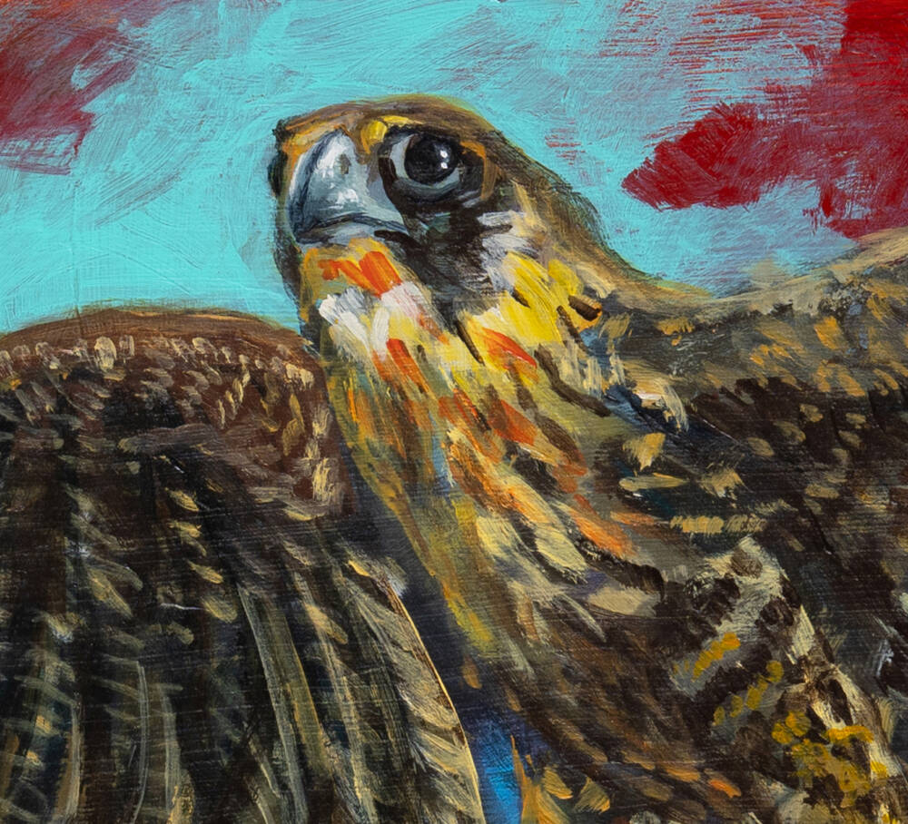 On her arm perches a vivid, aggressive hawk, its sharp features and wild nature providing a stark contrast to the delicate nudity of her form. Although her body is petite, I have imbued it with an intense sexual charge, turning her vulnerability into a source of undeniable power. Through the brushwork of her skin and the piercing gaze of the predator, I invite the viewer into a dark fantasy where the line between the tamer and the tamed is blurred. This painting is a celebration of that raw, primal connection, a fusion of cinematic nostalgia and contemporary eroticism that explores the beauty found in the most disturbing contrasts.