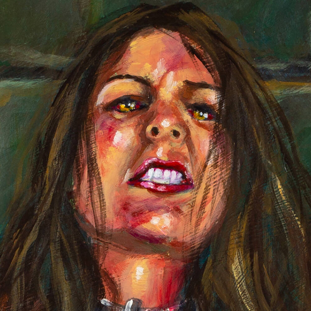 The painting masterfully explores the duality of beauty and the monstrous. While her hands have transitioned into lethal claws and her legs are consumed by beastial fur, she remains a figure of profound human beauty in her full nudity. This work delves into the “Dark Erotic” genre, tapping into the provocative allure of supernatural fantasies. The tension between her captive state and the emerging predator within creates a high-voltage erotic charge, turning a terrifying curse into a powerful display of primal desire and feminine strength.