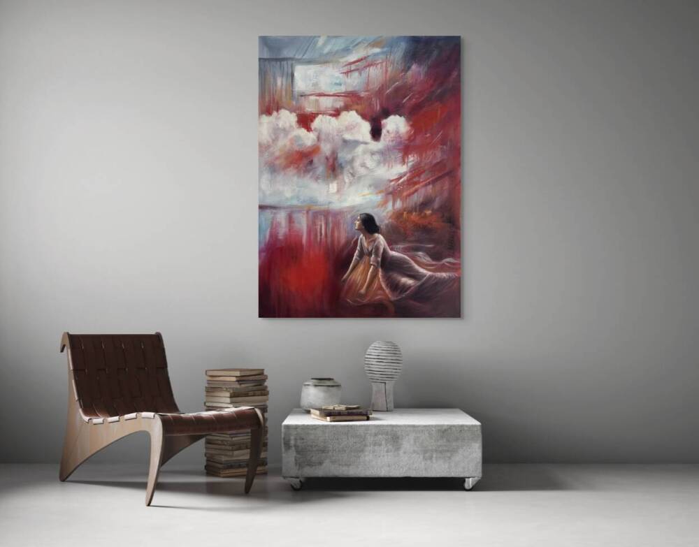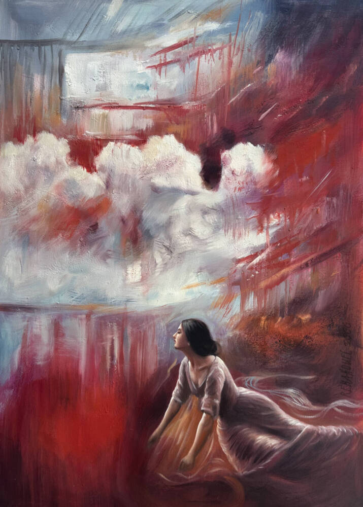 A moment of quiet awe unfolds in Where the Sky Breaks Open. Reanna Emanouel captures a cinematic stillness as a solitary figure gazes toward a sky alive with movement and light. Billowing clouds and painterly streaks of crimson, violet, and pale blue fill the canvas, creating a sense of atmosphere that is both dramatic and introspective.