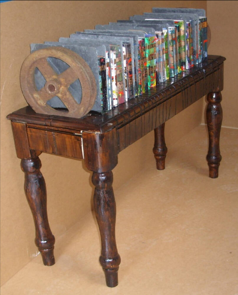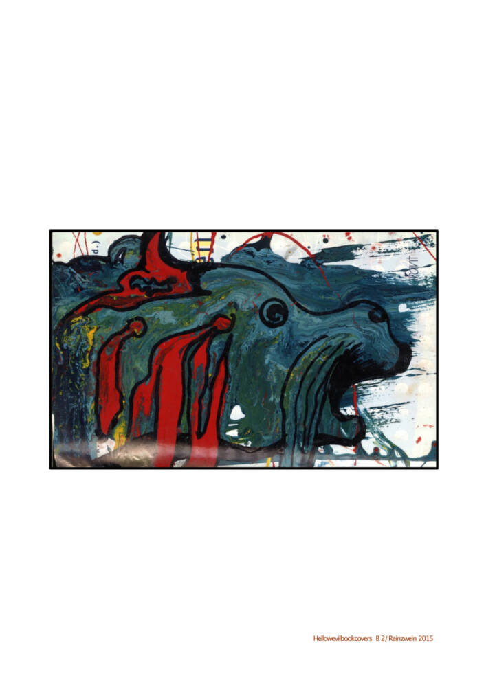 For a Halloween-event in 2014, I made scary objects to decorate the narrative space. One of them were books with screamy messy colors in mind. I spread the book covers upwards and action-painted them with all paints I could find. They iridescent because the paints weren’t compatible. To finalize them I used a marker and draw faces, animals… on it.