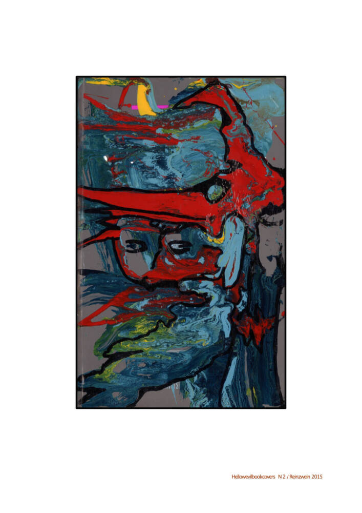 For a Halloween-event in 2014, I made scary objects to decorate the narrative space. One of them were books with screamy messy colors in mind. I spread the book covers upwards and action-painted them with all paints I could find. They iridescent because the paints weren’t compatible. To finalize them I used a marker and draw faces, animals… on it.