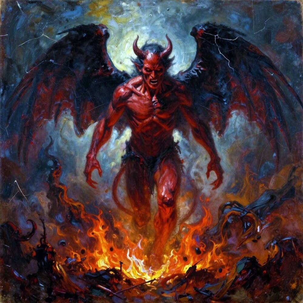 A towering figure of fire and shadow steps forward from the abyss, wings unfurled, horns crowned in flame, its presence radiating ancient power. Been down here a long time captures the exact moment a mythic being crosses the threshold between worlds a scene of raw force, ritual heat, and unstoppable ascent.