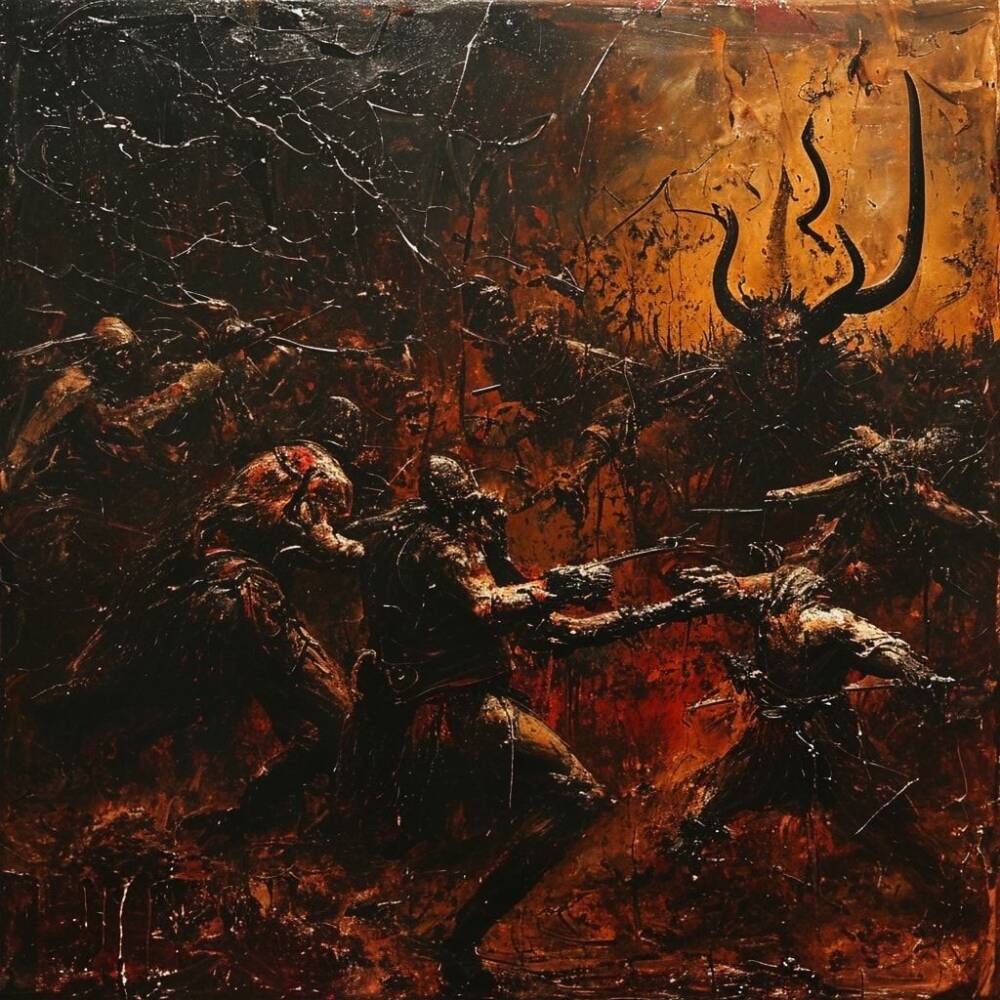 A brutal, mythic confrontation erupts across this painting a clash between armored warriors and a towering horned entity rising from fire and ruin. The scene is rendered with thick, expressive strokes and a visceral, painterly texture that feels almost volcanic. Flames churn through the background in molten reds, blacks, and ember‑orange, swallowing the battlefield in heat and shadow.