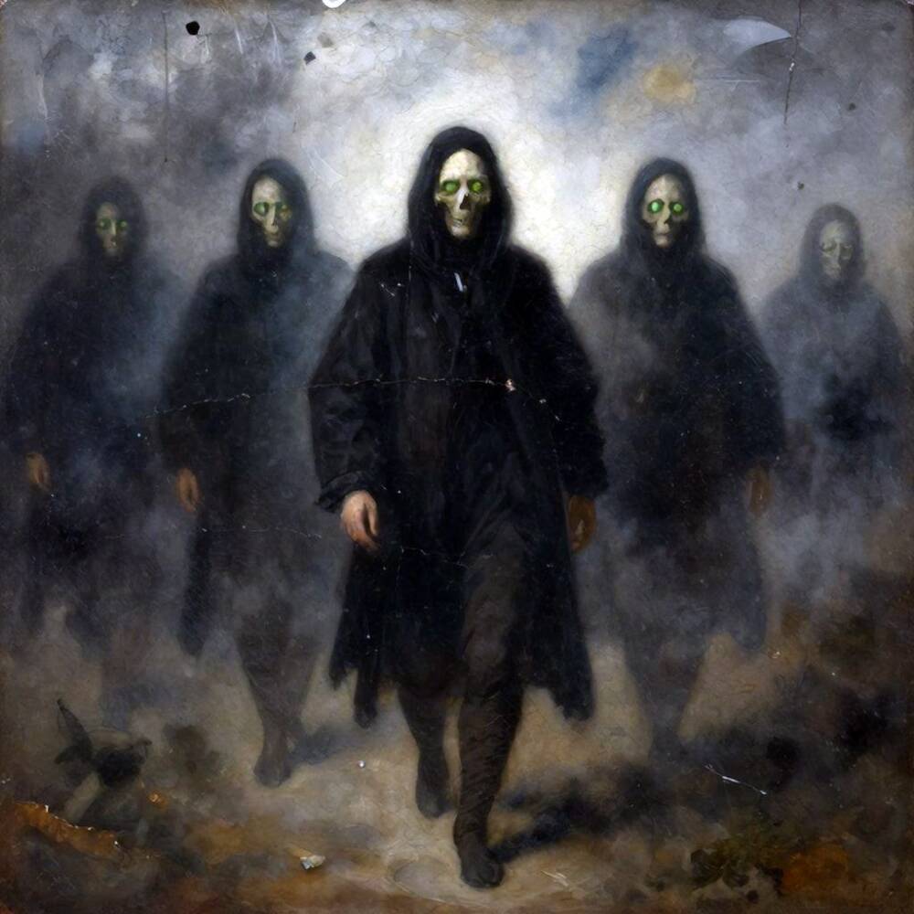 This artwork summons a haunting procession of cloaked skeletal figures emerging from smoke and shadow, their green‑lit eyes burning like embers in a dying world. Five hooded forms advance across barren ground, their long black robes dissolving into mist as if they are half‑spirit, half‑corpse. The central figure leads with an eerie, deliberate stride, giving the composition a sense of ritual movement a march, a summoning, or the arrival of something inevitable.