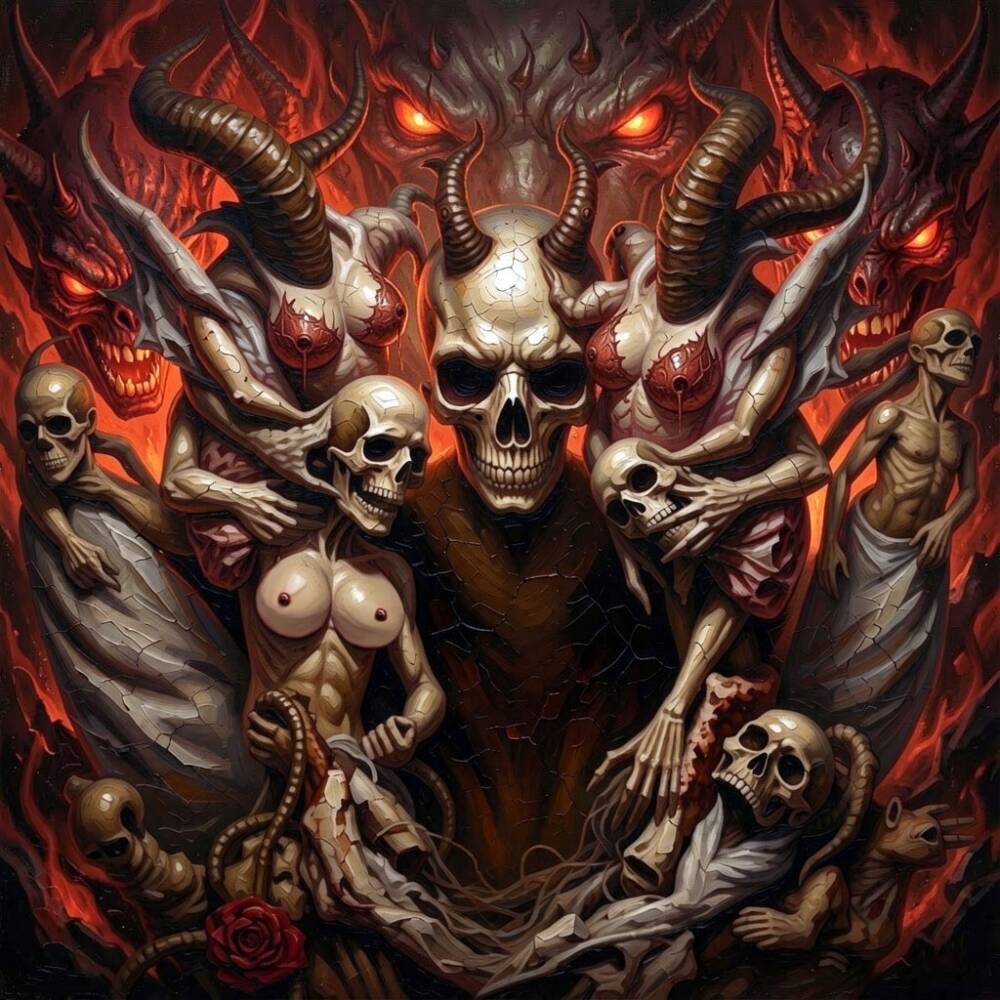 A blazing vision of death‑ritual and dominion, this artwork erupts with skeletal hierarchies, horned deities, and a furnace‑lit atmosphere that feels torn from an underworld liturgy. The central horned skull rises like a throned god, surrounded by skeletal attendants and demonic figures whose presence suggests ceremony, sacrifice, and ancient power.