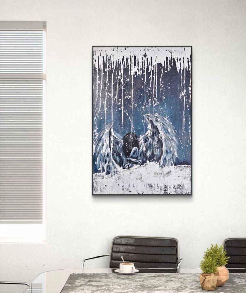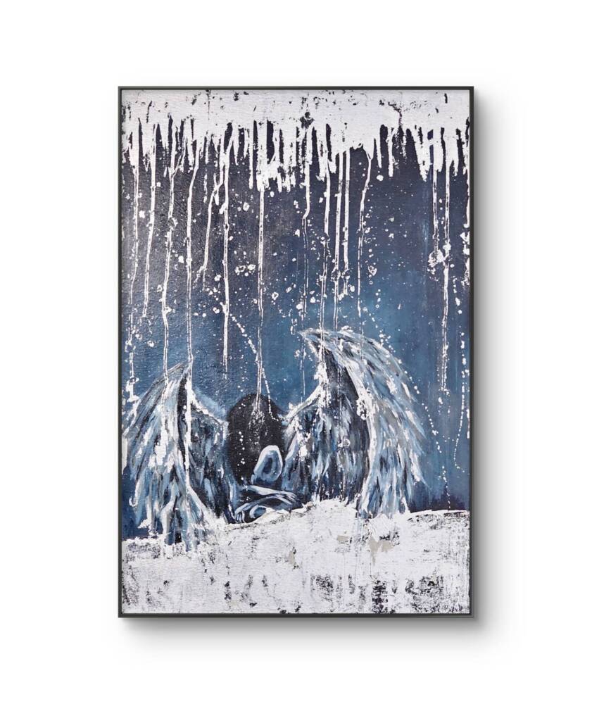 Celestial Refuge, featuring a fusion of abstract and symbolic elements, evokes a powerful sense of melancholy and introspection. Dominating the composition is a somber figure cloaked in darkness, its head bowed in a poignant pose. This figure appears to be an angel, characterized by large, ethereal wings cascading downwards. The wings are rendered in hues of white and light blue, creating a stark contrast against the deep, muted blue background. This background is layered with white drips and splatters, which descend from the top of the painting, adding a raw, almost unfinished texture to the piece. The combination of these elements heightens the emotional depth, suggesting themes of sorrow, abandonment, or contemplation. The overall effect is both striking and haunting, capturing the viewer’s attention and drawing them into the painting’s emotionally charged narrative.