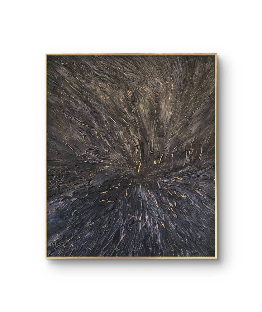 This painting, titled “Reflections of Eternity,” exudes an enigmatic and profound aura. It is an abstract piece that utilizes a dark, textured palette to evoke a sense of depth and infinity. The swirling, layered strokes converge towards the centre, creating a dynamic focal point that draws the viewer’s gaze inward, as if peering into the very fabric of the cosmos. Flecks of lighter hues interspersed throughout the composition resemble distant stars or glimmers of light, adding contrast and highlighting the intricate details of the texture. The overall effect is both mesmerizing and contemplative, inviting the observer to reflect on the vastness and mystery of the universe. Framed in a subtle, slim outline, the painting maintains a sense of elegance while allowing the intricate textures and rich, dark tones to take centre stage.