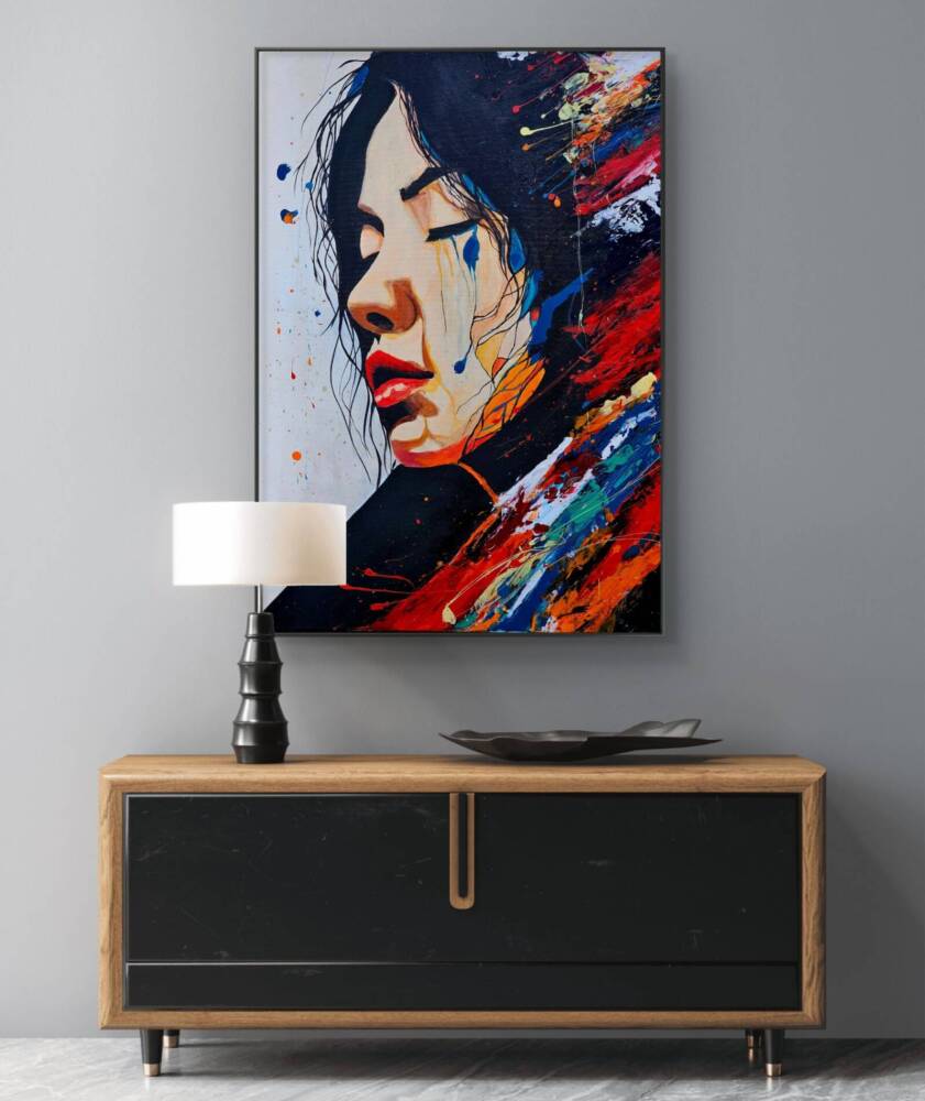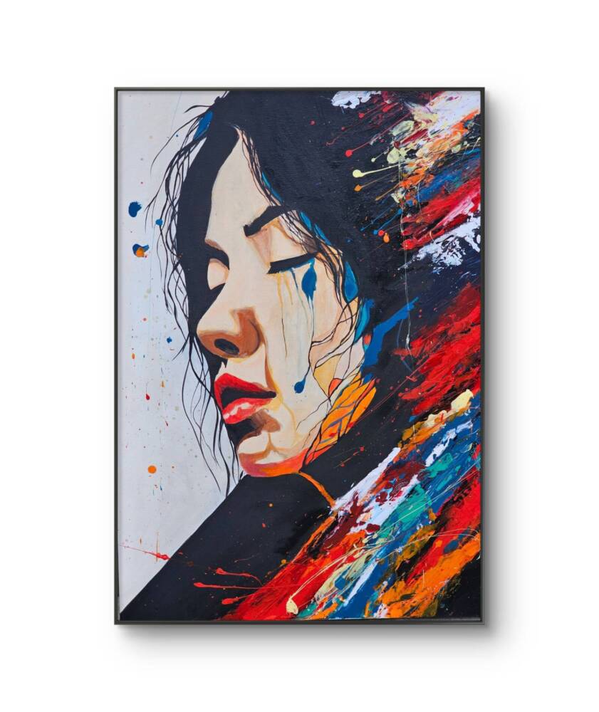 “Whispers” is an evocative painting that captures a moment of introspection and emotion. A woman’s face, rendered with a mix of realism and abstract expression, occupies the canvas. Her eyes are closed, suggesting a serene or contemplative state, while vibrant splashes of color—ranging from bold reds to deep blues and vibrant yellows—spill across the artwork, representing the intensity of her inner thoughts and emotions. The juxtaposition of the calmness in her expression and the chaos of the surrounding colors creates a compelling narrative of quiet strength and powerful emotion.