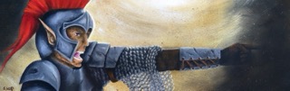 A hazy sky with a beam of sunlight coming through to land on the elf commander as he shouts out orders in the battlefield. Face twisted as he shouts with dirt and blood splattered over his face. Armor grim and dented reflect the sunlight. Making for a stunning fantasy painting.