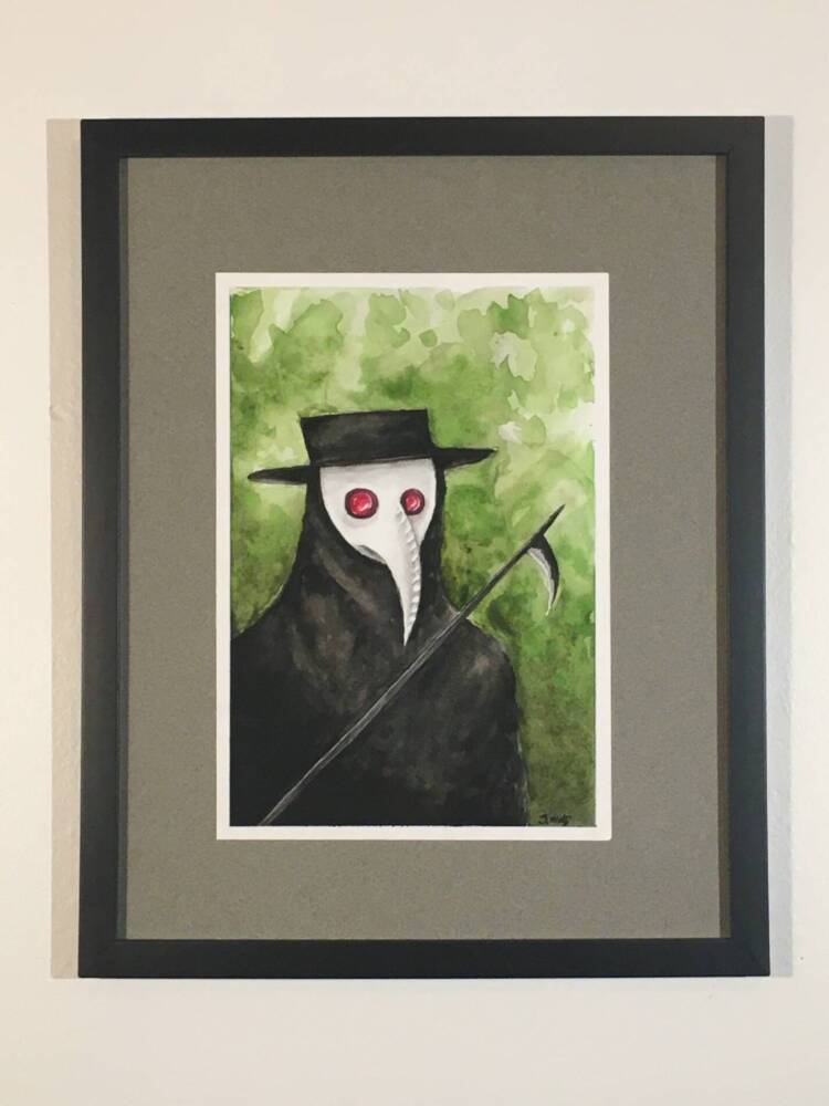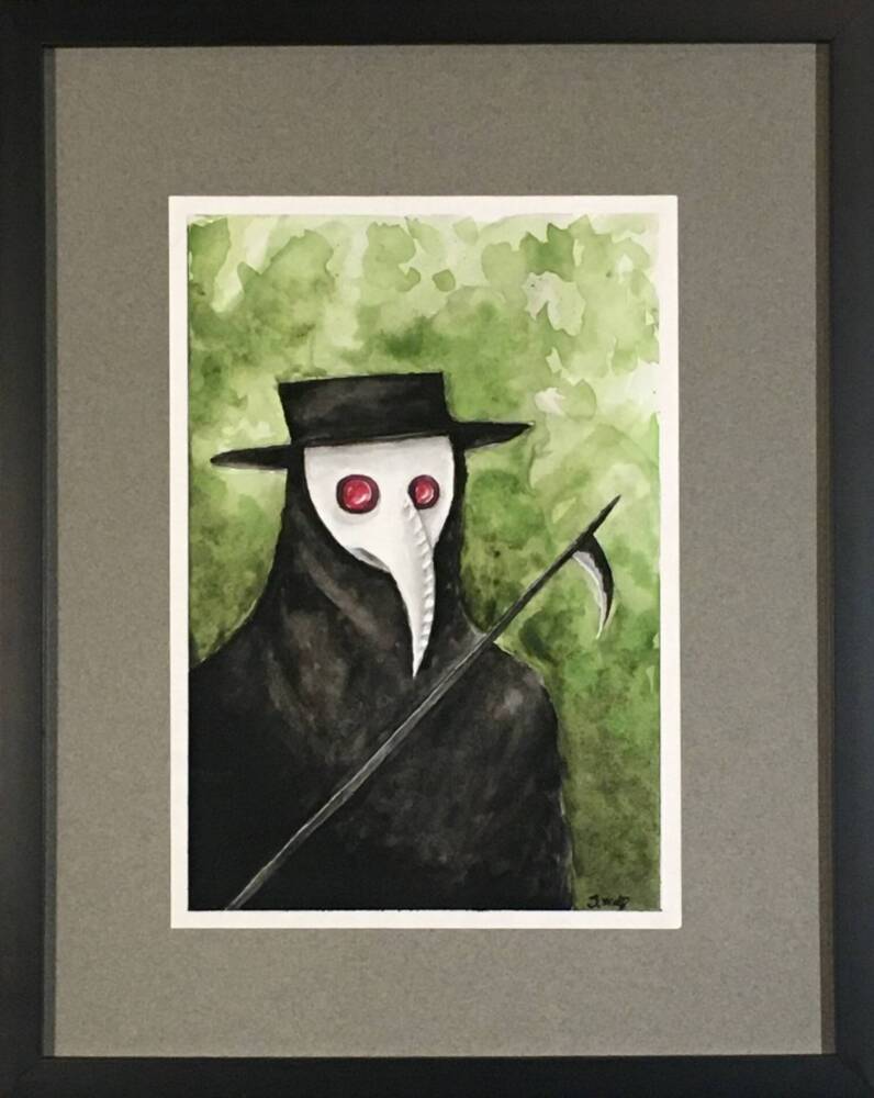With a cloud of green gas covering the background. With red eyes shining from the plague mask.