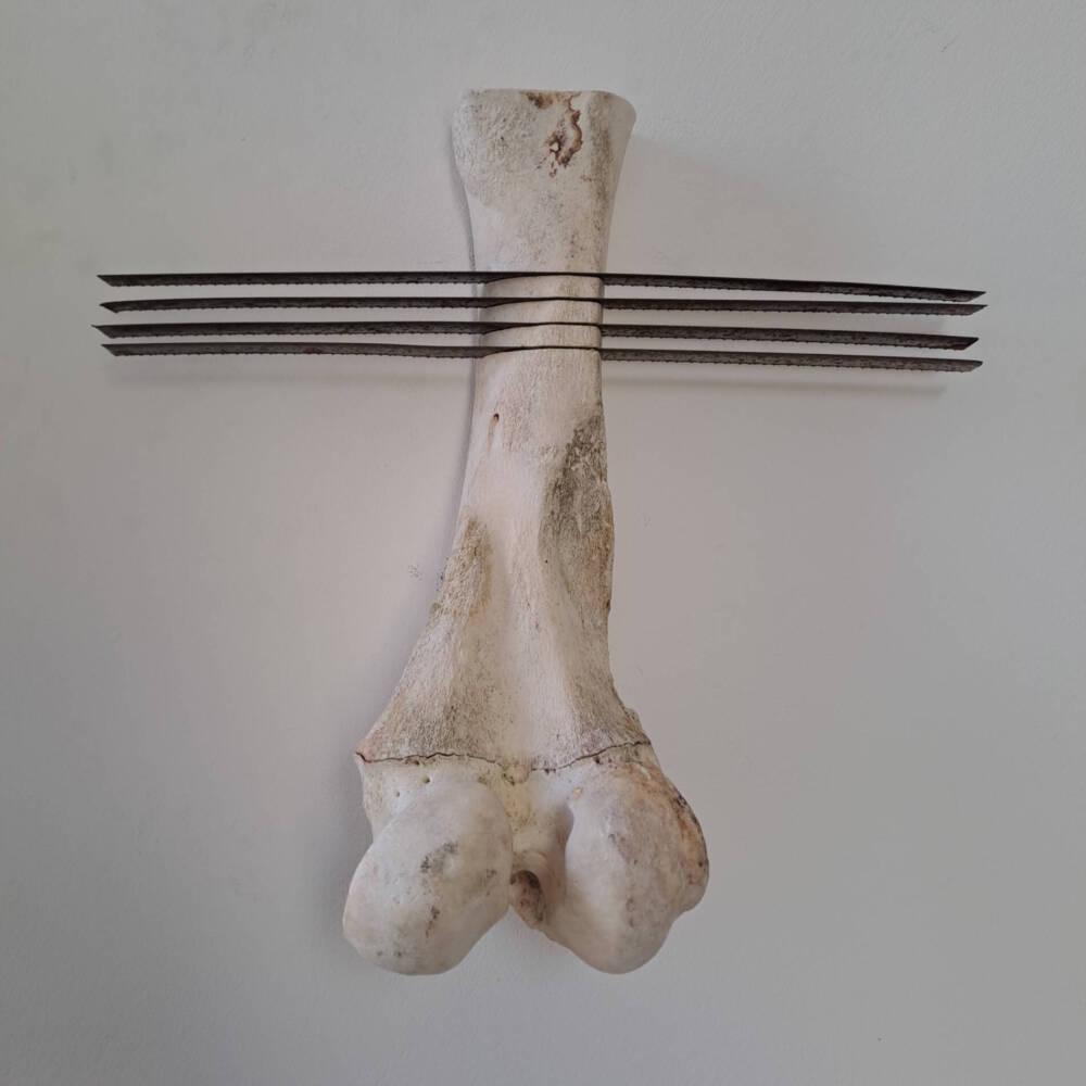 This sculpture highlight this by showing a piece of bone ressembling a p*nis making the central part of a cross, which other branches are done by rusted saw blades cutting the p*nis – maybe thus suggesting a solution ?