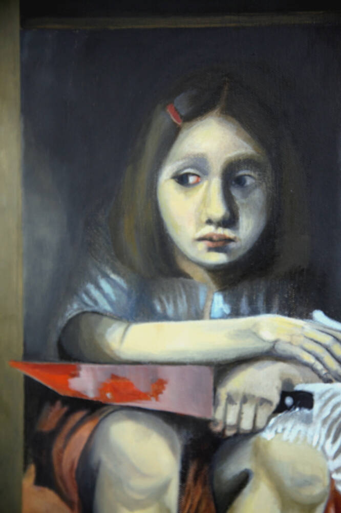 The child’s sadness suggests unwillingness and vulnerability. The child is also a participant in something painful or wrong.