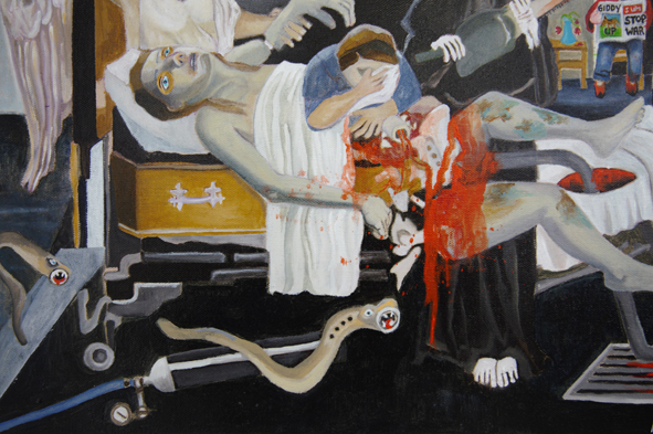 Fabricated from fragments and faith, Moribund captures the threshold between life and death. A blood-soaked hospital bed becomes both altar and coffin. A drainpipe overflows with red blood. An angel lifts a limp arm while the Grim Reaper, grinning and bloodied, holds a chainsaw. Nearby, a mother weeps. The morgue-like room extends into a surreal universe — a man dressed as a devil reads the newspaper, an open drawer waits for a body, and the cosmos glows with the possibility of another dimension. A final breath hangs in the dark, broken only by the bright, unreachable light in the distance.