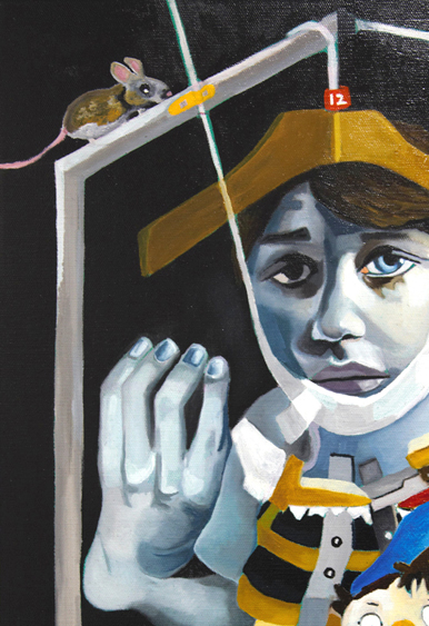 The boy sits inside a cupboard, held by puppet strings from a hanger above, cradling a jester doll. These symbols reflect innocence, control, and the burden of masking pain. A mouse watches from above, while disjointed medical elements hint at quiet suffering.