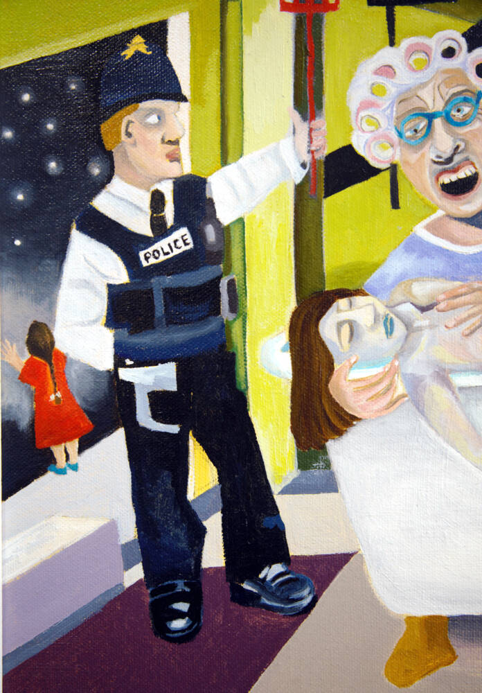 A vivid, unsettling scene unfolds in a domestic interior: a woman screams, a policeman stands holding a fly swatter, and a giant fly enters the frame. A bewildered dog gazes at the viewer, while a distant figure reaches toward the stars. Blending absurdity and sorrow, the painting captures the surreal stillness of a moment fractured by grief.