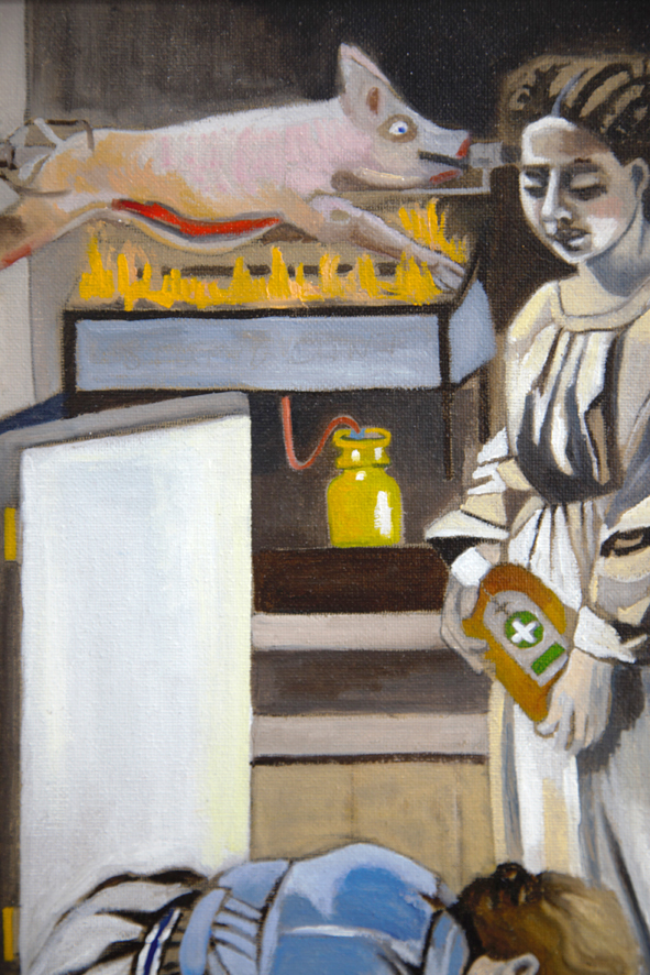 To the right, a pig is roasting over a fire pit, grotesquely split — a possible symbol of the man in her life, of violence, of consumption. The door at the edge of the frame opens into blackness. Escape? Or simply another unknown?