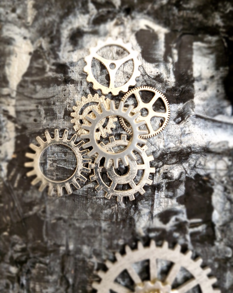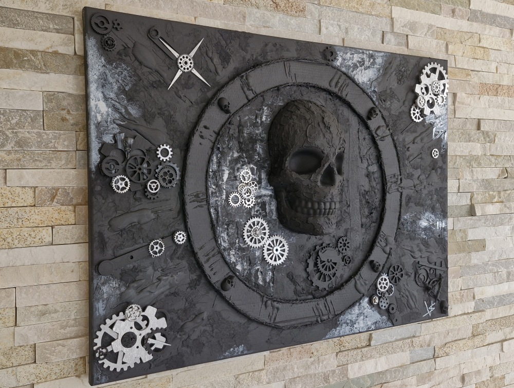Ambiance industrielle et crépusculaire. Un crâne noir mat émerge d’une matière rugueuse comme figé dans la lave. Il trône au centre d’un cercle rituel, ceint de petits crânes et d’empreintes mécaniques fragment d’un temps broyé. Le contraste entre les textures brutes, les éclats métalliques et les nuances de gris crée un univers où le temps, la matière et la mémoire s’effondrent lentement.