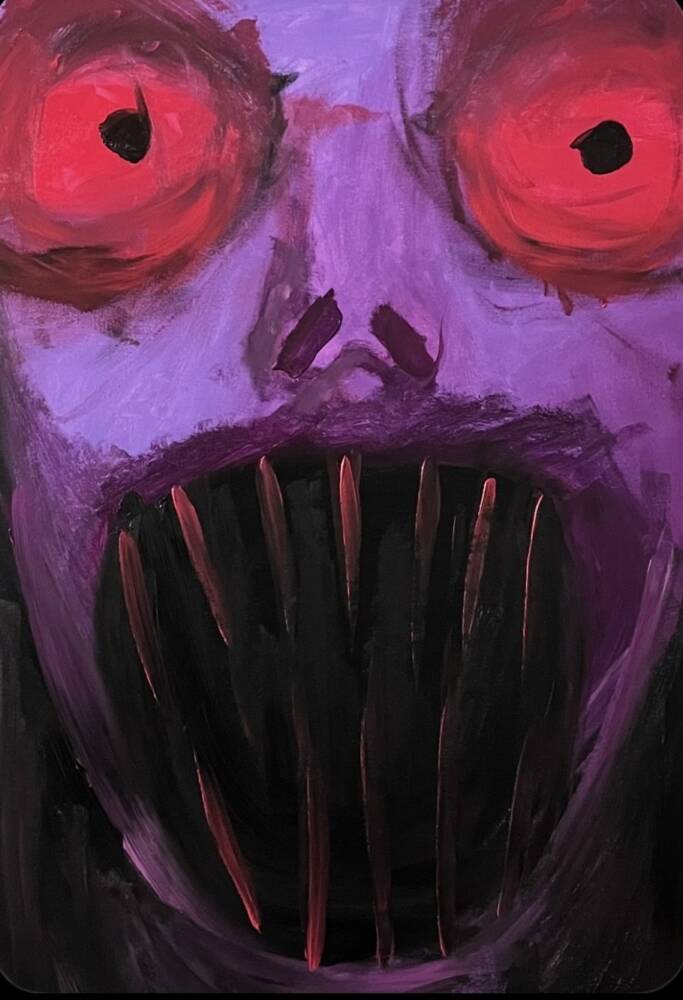 Red, unyielding eyes fix the viewer in a state of confrontation, while a cavernous black mouth, edged with sharp, blood-toned teeth, suspends the figure between a scream and an act of consumption. This ambiguity becomes central to the work’s psychological charge.