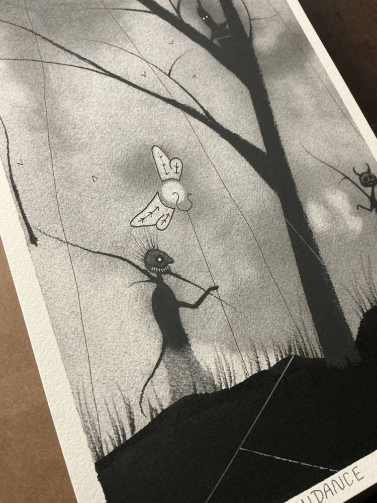 Ink, graphite and charcoal on 100% cotton paper. 9×12, please note, this piece is slightly larger than 9×12 and will not fit in a traditional 9×12 frame. Consider matting to fit an 11×14 frame, or talk to your local framer for options.