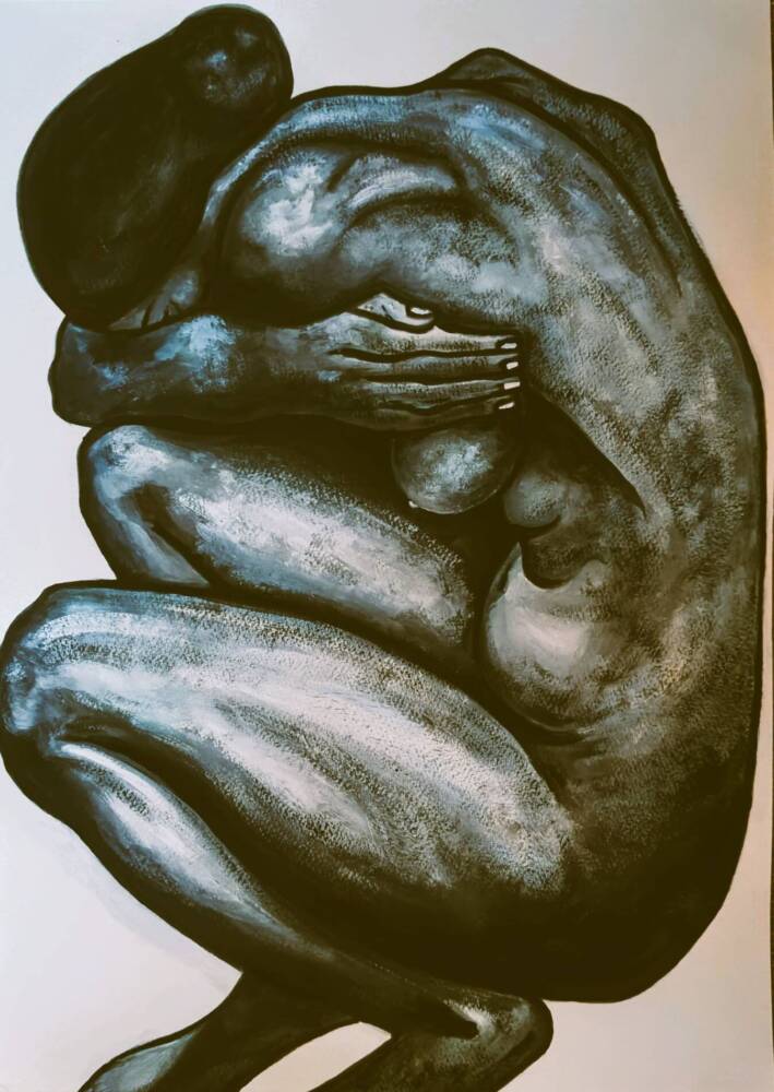 Dark female figure wrapped in an embrace towards herself. Tribute to Georges Dorignac.