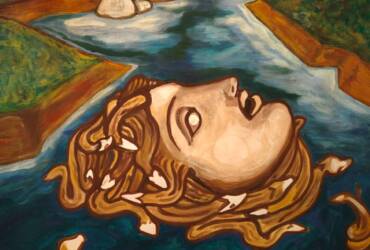 against enemies: his figure was placed in the form of an idol in defense of ports, in the form of a protome on the prow of ships and as a protective effigy on the shields of soldiers. The painting depicts her in all her seductive power, wrapped in the mist of mystery with floating hair in which snakes creep. Her figure has often been associated with that of Hecate/Selene, goddess of the moon, due to her changing and enigmatic nature. The artist has chosen to represent the myth in its original beauty, without however renouncing to represent the dark and sensual side of the myth using the image of the Italian actress Ornella Muti for the realization of the face. The painting has undergone changes in the eyes (before with, then without- artist’s choice).