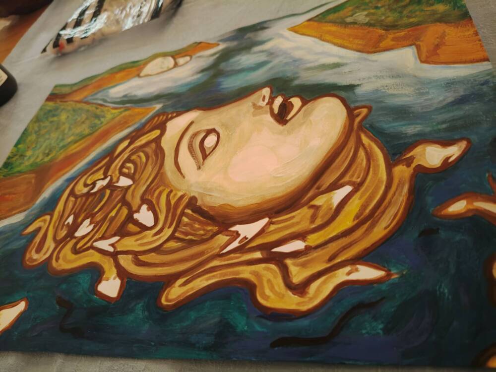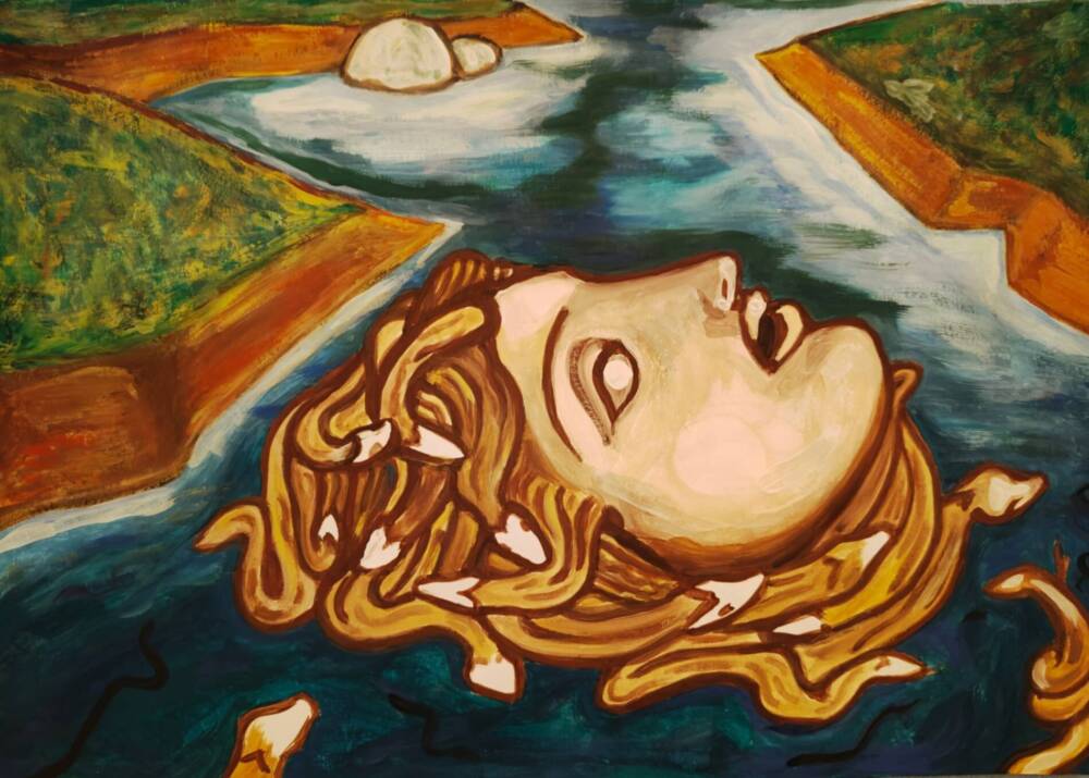 The painting represents the face of Medusa emerging from the waters. The myth is represented in the role of the melancholic Ophelia, a character from Shakespeare’s tragedy Hamlet. Driven by despair at Hamlet’s refusal, she lets herself drown in the waters of a pond. The artwork is part of the new “Facescapes” collection. Facescapes are studies about symbol, myth and archetype through nature’s morphology as expressions of biophilia. These faces emerge from the landscape like islands and merge with it through tectonic forms and the landscape’s morphology. The figures represented fall somewhere between physics and metaphysics, according to Aristotle’s philosophy which they are divided into representation of nature (physics) and its cognitive investigation (meta-physics).
