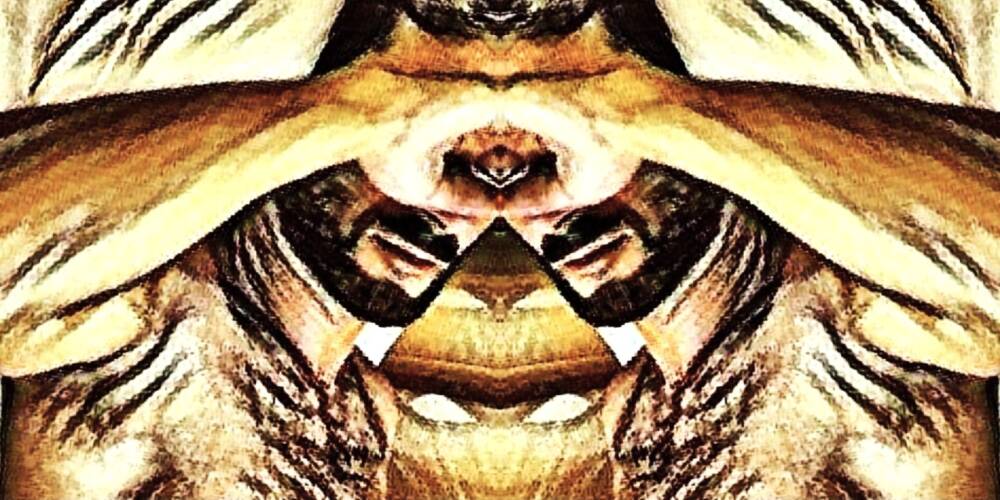 Digital artwork printed on canvas. The print is a digital reinterpretation of a self-photograph. The title refers to the shared eye by the mirror figures and inspired by the cyclop Polyphemus.